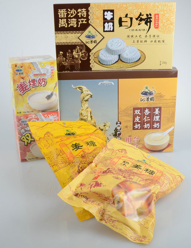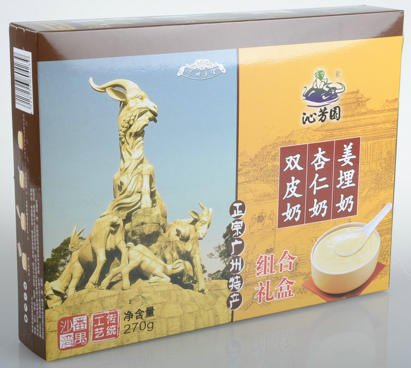 特色:组合装里装有双皮奶、杏仁奶和姜埋奶三种口味。