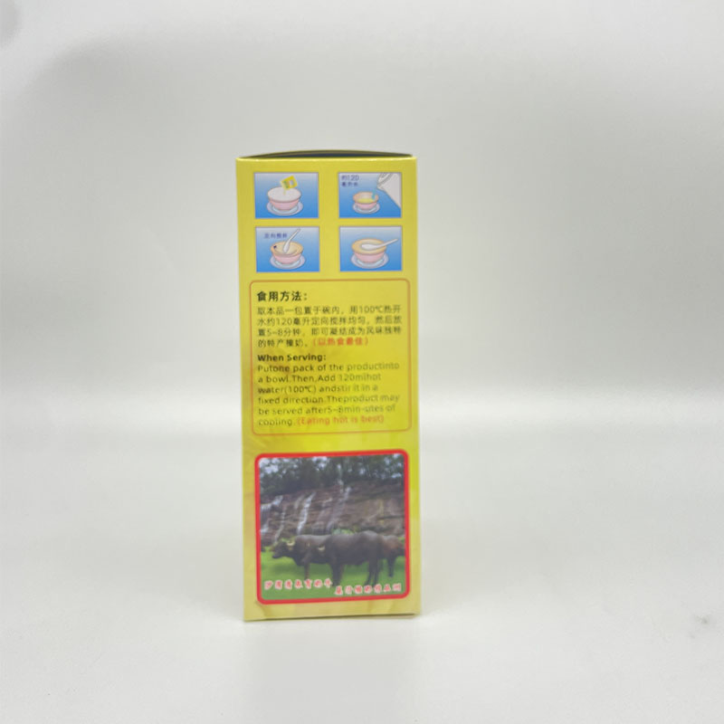 取本品一包置于碗内,用90度~100度热开水约120毫升定向搅拌均匀,不能搅太久,然后静置3~8分钟,即可凝结成为风味独特的撞奶。携带方便,风味浓郁,香滑可口,原汁原味,老少皆宜!